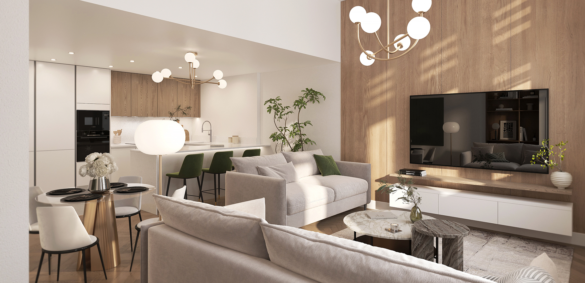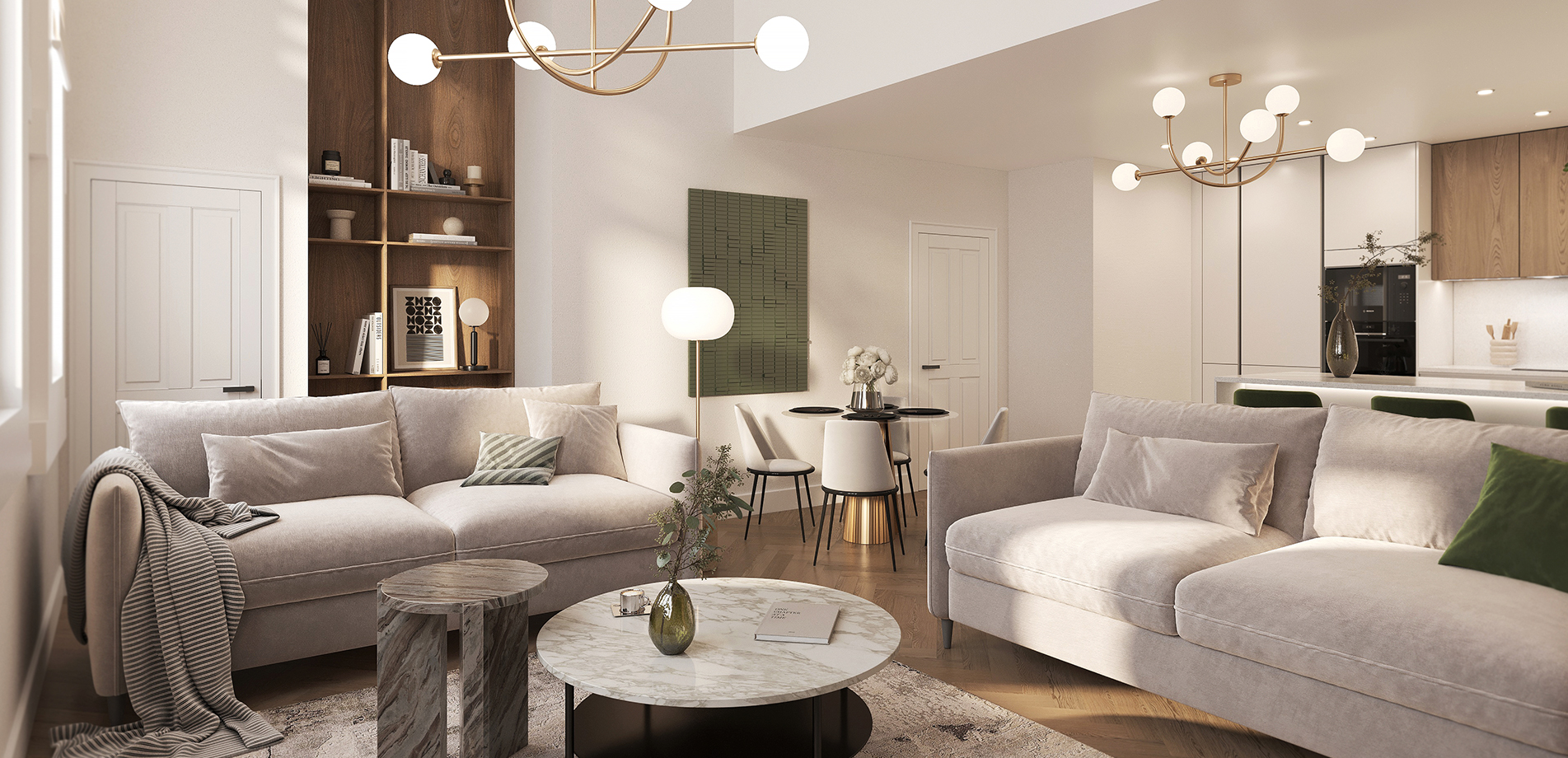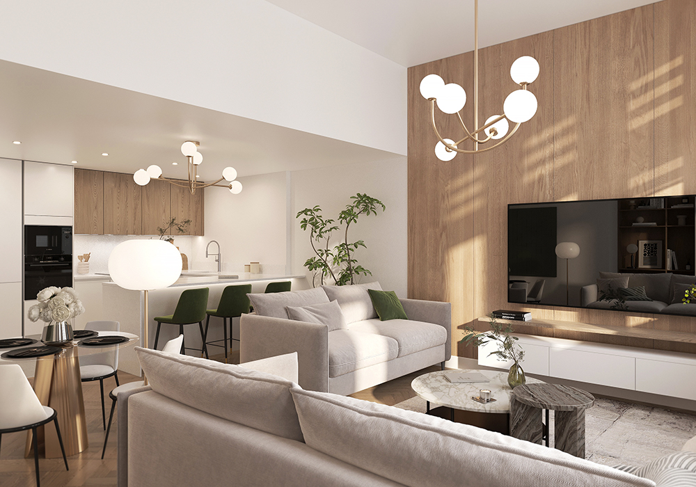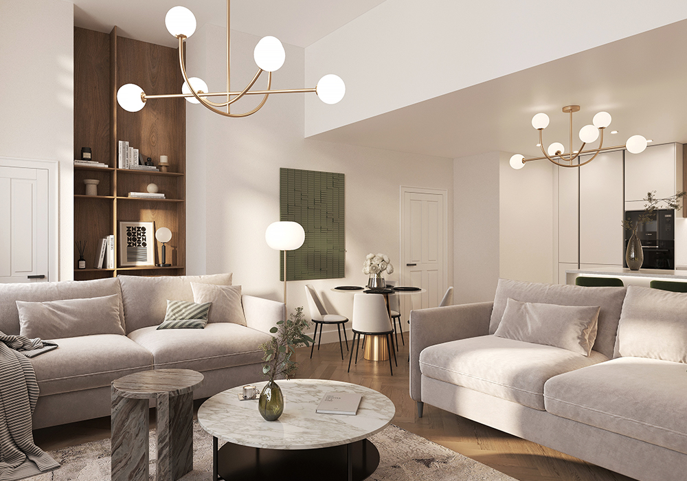 Light filled living/dining room with high specification German manufactured kitchen including integrated appliances and feature breakfast bar. Generous master bedroom complete with luxury en-suite.